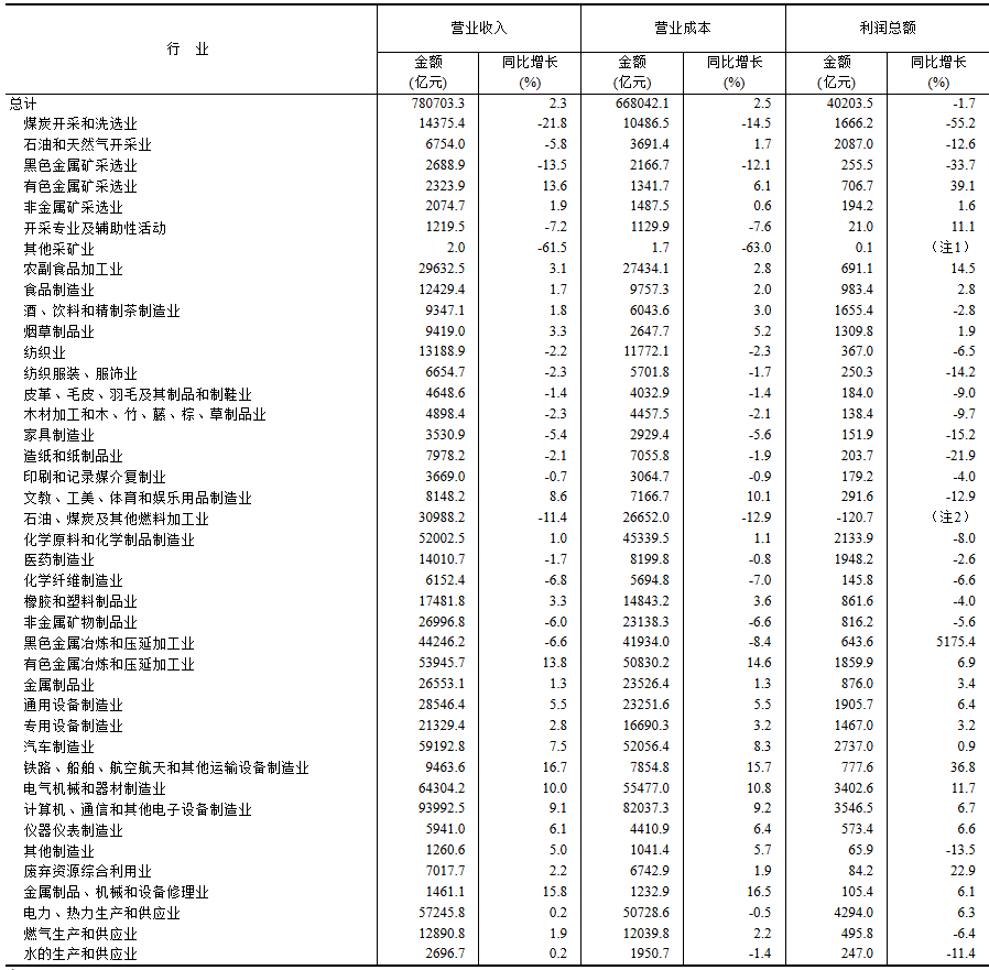 1—7月份,主要行业利润情况如下:农副食品加工业利润同比增长14.5%,电气机械和器材制造业增长11.7%,有色金属冶炼和压延加工业增长6.9%,计算机、通信和其他电子设备制造业增长6.7%,通用设备制造业增长6.4%,电力、热力生产和供应业增长6.3%,专用设备制造业增长3.2%,汽车制造业增长0.9%,非金属矿物制品业下降5.6%,纺织业下降6.5%,化学原料和化学制品制造业下降8.0%,石油和天然气开采业下降12.6%,煤炭开采和洗选业下降55.2%,石油煤炭及其他燃料加工业同比减亏。