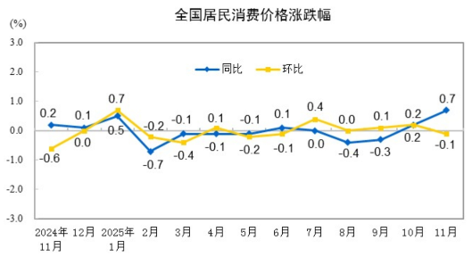 2025年11月份,全国居民消费价格同比上涨0.7%。其中,城市上涨0.7%,农村上涨0.4%;食品价格上涨0.2%,非食品价格上涨0.8%;消费品价格上涨0.6%,服务价格上涨0.7%。1—11月平均,全国居民消费价格与上年同期持平。