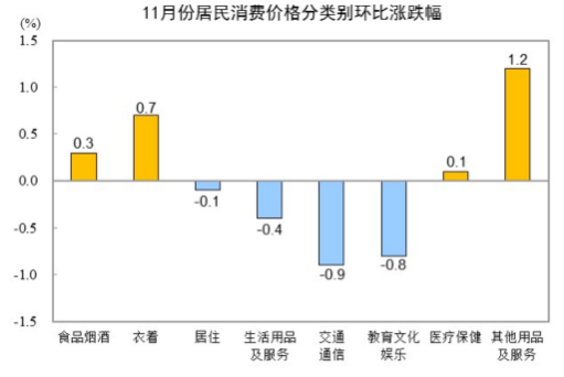 图表:11月份居民消费价格分类别同比涨跌幅