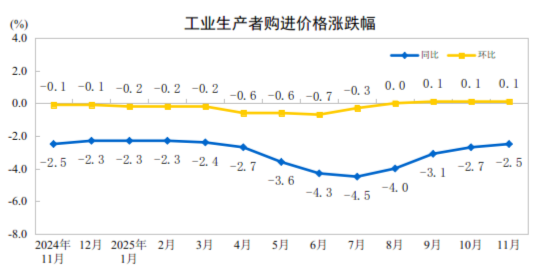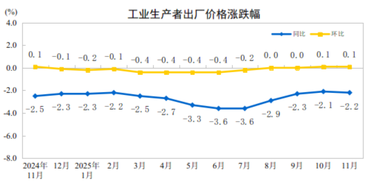 2025年11月份,全国工业生产者出厂价格同比下降2.2%,工业生产者购进价格同比下降2.5%;工业生产者出厂价格和购进价格环比均上涨0.1%,涨幅均与上月相同。1—11月平均,工业生产者出厂价格比上年同期下降2.7%,工业生产者购进价格下降3.1%。
