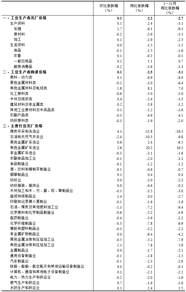 11月份,工业生产者出厂价格中,生产资料价格上涨0.1%,影响工业生产者出厂价格总水平上涨约0.08个百分点。其中,采掘工业价格上涨1.7%,原材料工业价格下降0.2%,加工工业价格上涨0.1%。生活资料价格持平。其中,食品价格下降0.1%,衣着价格上涨0.1%,一般日用品价格上涨0.2%,耐用消费品价格下降0.2%。