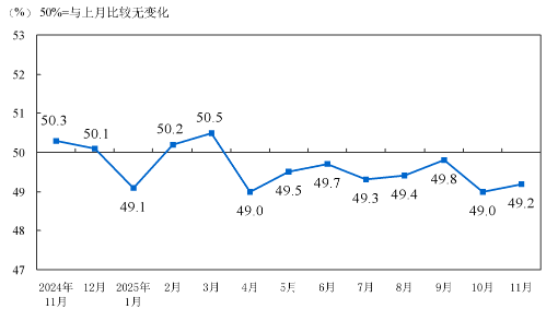 11月份,制造业采购经理指数(PMI)为49.2%,比上月上升0.2个百分点,景气水平有所改善。