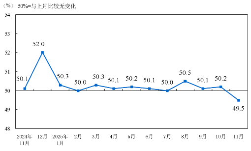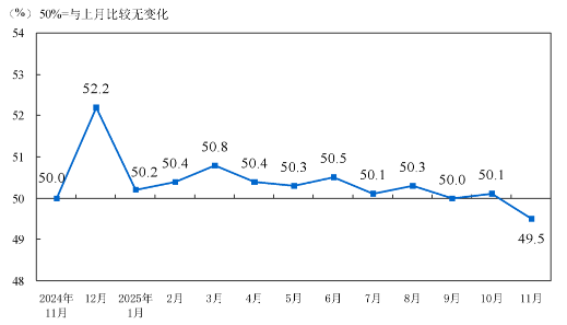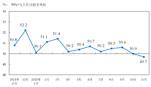 11月份,综合PMI产出指数为49.7%,比上月下降0.3个百分点。