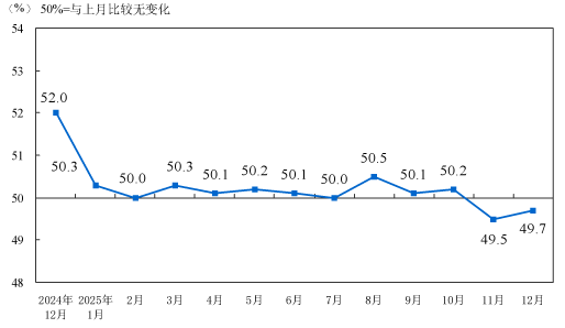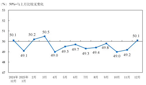 12月份,制造业采购经理指数(PMI)为50.1%,比上月上升0.9个百分点,升至扩张区间。