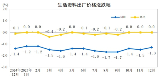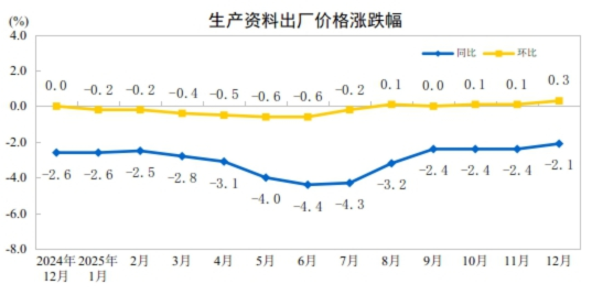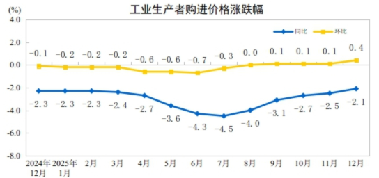 2025年12月份,全国工业生产者出厂价格同比下降1.9%,降幅比上月收窄0.3个百分点;环比上涨0.2%,涨幅比上月扩大0.1个百分点。工业生产者购进价格同比下降2.1%,降幅比上月收窄0.4个百分点;环比上涨0.4%,涨幅比上月扩大0.3个百分点。2025年全年,工业生产者出厂价格下降2.6%,工业生产者购进价格下降3.0%。