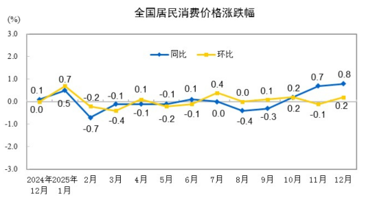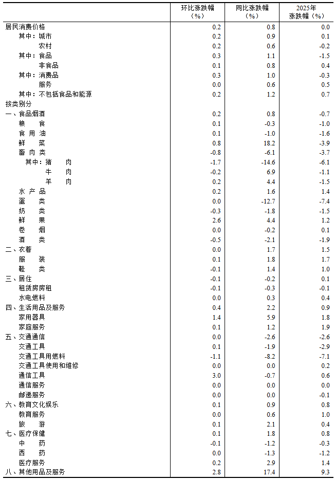 2025年12月份,全国居民消费价格同比上涨0.8%。其中,城市上涨0.9%,农村上涨0.6%;食品价格上涨1.1%,非食品价格上涨0.8%;消费品价格上涨1.0%,服务价格上涨0.6%。
