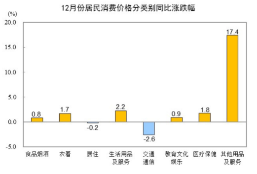 12月份,食品烟酒类价格环比上涨0.2%,影响CPI上涨约0.05个百分点。食品中,鲜果价格上涨2.6%,影响CPI上涨约0.05个百分点;鲜菜价格上涨0.8%,影响CPI上涨约0.02个百分点;畜肉类价格下降0.8%,影响CPI下降约0.02个百分点,其中猪肉价格下降1.7%,影响CPI下降约0.02个百分点。