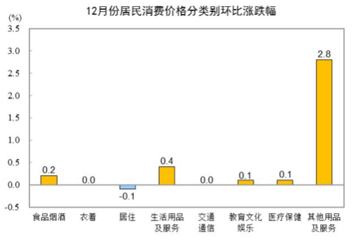 12月份,全国居民消费价格环比上涨0.2%。其中,城市上涨0.2%,农村上涨0.2%;食品价格上涨0.3%,非食品价格上涨0.1%;消费品价格上涨0.3%,服务价格持平。