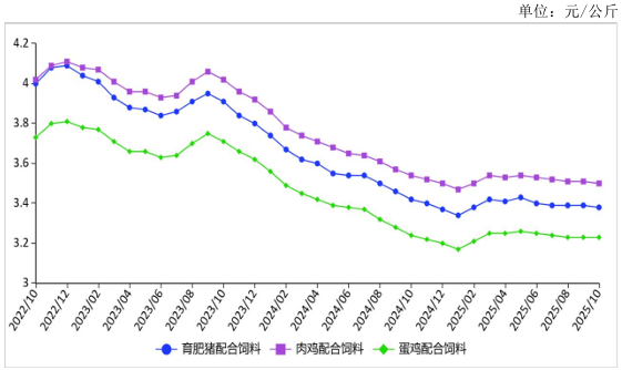 (二)主要原料现货价格略有下降。大豆到港量维持较高水平,国内油厂大豆压榨开机率整体处于较高水平,豆粕库存有所上升,价格略有下跌。根据农业农村部监测,10月份国内豆粕均价每公斤3.28元,环比跌0.8%,同比跌3.2%;新季玉米集中上市,产量有所增长。华北持续阴雨导致当地玉米存储难度加大,加速基层售粮节奏,玉米价格小幅下跌。饲用玉米均价每公斤2.48元,环比跌0.4%,同比涨2.8%。