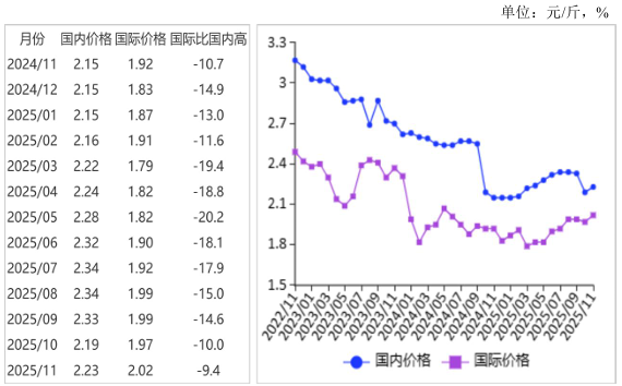 图表:2022-2025年11月国内外大豆价格走势图