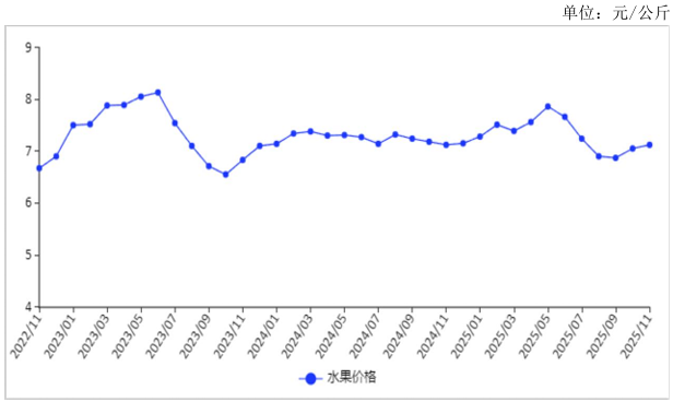 (三)预计后期水果价格上涨。后期水果市场总体供给充足,以应季柑橘和库存苹果、梨为主,受季节性规律和年底节假日消费拉动,预计水果价格继续上涨。具体来看,新产季富士苹果已基本完成入库,据卓创资讯统计,截至11月27日,全国冷库库存量729.35万吨,较去年同期减少14.5%,苹果期货主力合约(AP601)11月27日收盘价每吨9529元,较10月末上涨3.11%,预计后期苹果价格将稳中有升。柑橘类上市量持续加大,后续沃柑、耙耙柑等中晚熟品种陆续批量入市,预计价格延续下行趋势。各地设施草莓上市量逐步增加,预计后期价格涨幅将明显收窄。海运智利车厘子初期因到港量有限,价格较高。