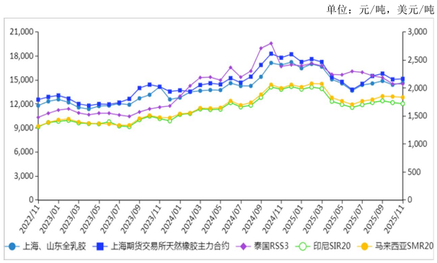 图表:2022-2025年11月天然橡胶价格走势图