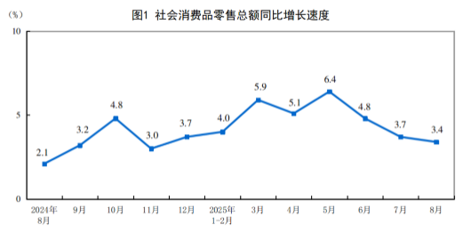 8月份,社会消费品零售总额39668亿元,同比增长3.4%。其中,除汽车以外的消费品零售额35575亿元,增长3.7%。1—8月份,社会消费品零售总额323906亿元,增长4.6%。其中,除汽车以外的消费品零售额292643亿元,增长5.1%。