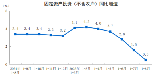 2025年1—8月份,全国固定资产投资(不含农户)326111亿元,同比增长0.5%。其中,民间固定资产投资同比下降2.3%。从环比看,8月份固定资产投资(不含农户)下降0.20%。