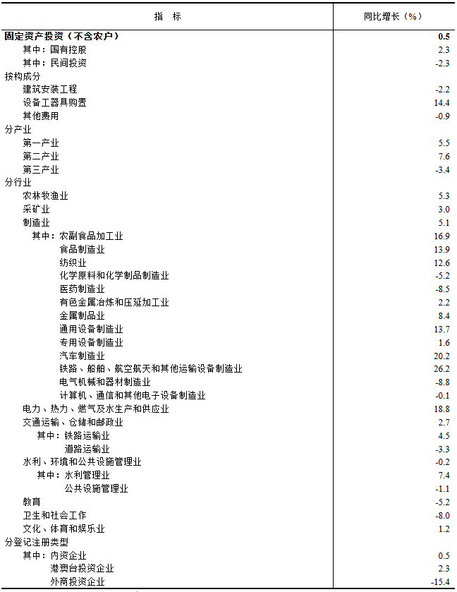 分登记注册类型看,内资企业固定资产投资同比增长0.5%,港澳台企业固定资产投资增长2.3%,外商企业固定资产投资下降15.4%。