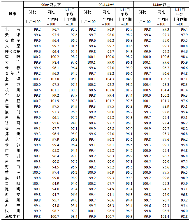 图表:2025年11月70个大中城市新建商品住宅销售价格指数