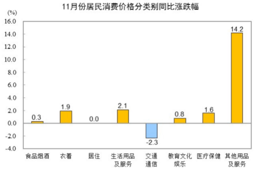 图表:11月份居民消费价格分类别同比涨跌幅