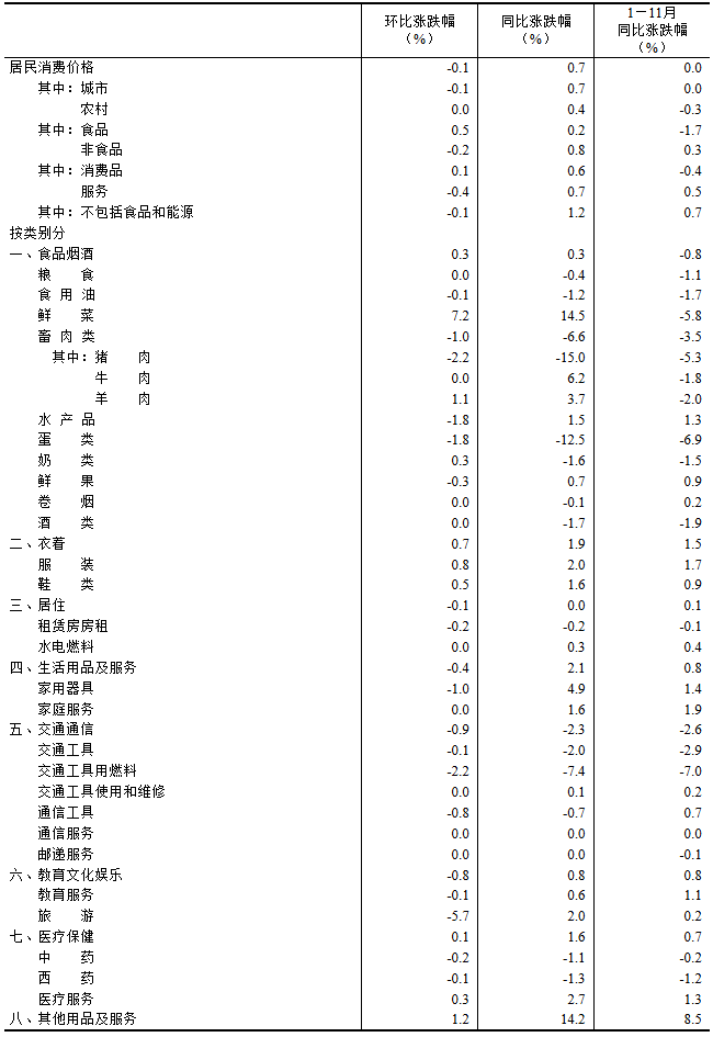 11月份,全国居民消费价格环比下降0.1%。其中,城市下降0.1%,农村持平;食品价格上涨0.5%,非食品价格下降0.2%;消费品价格上涨0.1%,服务价格下降0.4%。