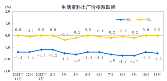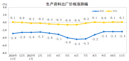 2025年11月份,全国工业生产者出厂价格同比下降2.2%,工业生产者购进价格同比下降2.5%;工业生产者出厂价格和购进价格环比均上涨0.1%,涨幅均与上月相同。1—11月平均,工业生产者出厂价格比上年同期下降2.7%,工业生产者购进价格下降3.1%。
