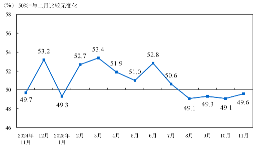 11月份,综合PMI产出指数为49.7%,比上月下降0.3个百分点。