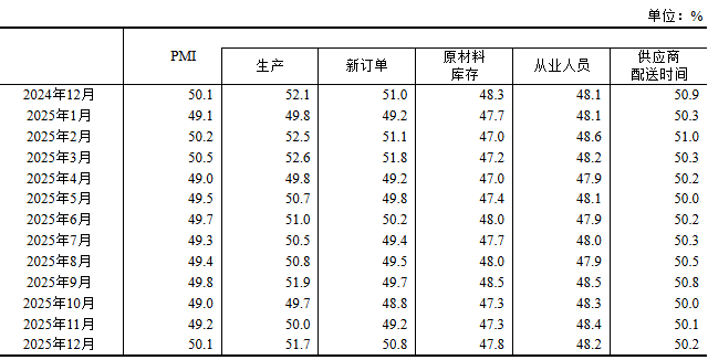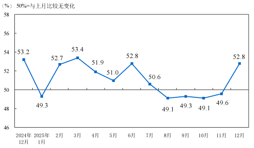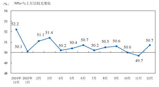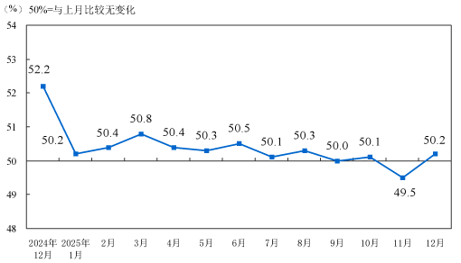 12月份,制造业采购经理指数(PMI)为50.1%,比上月上升0.9个百分点,升至扩张区间。