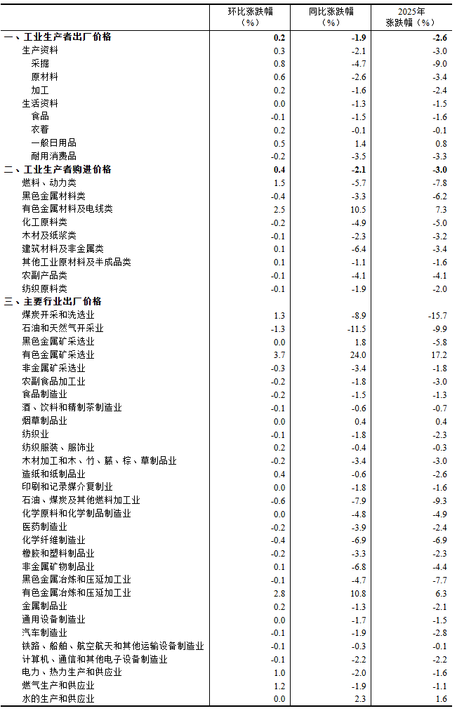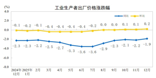 2025年12月份,全国工业生产者出厂价格同比下降1.9%,降幅比上月收窄0.3个百分点;环比上涨0.2%,涨幅比上月扩大0.1个百分点。工业生产者购进价格同比下降2.1%,降幅比上月收窄0.4个百分点;环比上涨0.4%,涨幅比上月扩大0.3个百分点。2025年全年,工业生产者出厂价格下降2.6%,工业生产者购进价格下降3.0%。