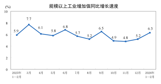1—2月份,规模以上工业增加值同比实际增长6.3%(增加值增速均为扣除价格因素的实际增长率)。从环比看,2月份,规模以上工业增加值比上月增长0.83%。