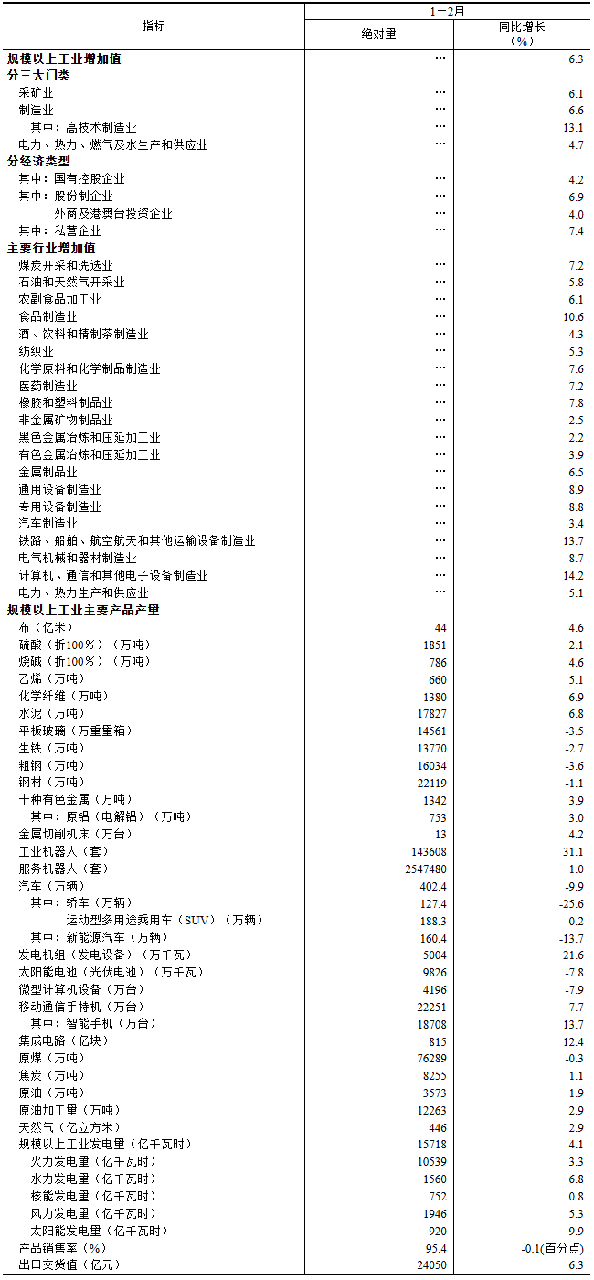 分产品看,1—2月份,规模以上工业626种产品中有397种产品产量同比增长。其中,钢材22119万吨,同比下降1.1%;水泥17827万吨,增长6.8%;十种有色金属1342万吨,增长3.9%;乙烯660万吨,增长5.1%;汽车402.4万辆,下降9.9%,其中新能源汽车160.4万辆,下降13.7%;发电量15718亿千瓦时,增长4.1%;原油加工量12263万吨,增长2.9%。