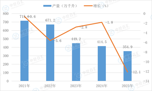 根据国家统计局数据显示,2025年,白酒(折65度,商品量)产量354.9万千升,同比增长-12.1%。