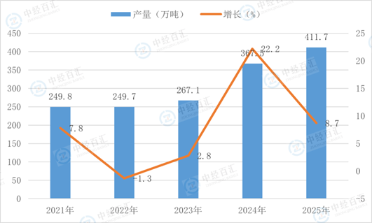 根据国家统计局数据显示,2025年,化学农药原药(折有效成分100%)产量411.7万吨,同比增长8.7%。
