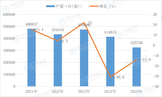 根据国家统计局数据显示,2025年,大气污染防治设备产量325730台(套),同比增长-13.9%。