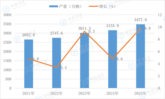 根据国家统计局数据显示,2025年,汽车产量3477.8万辆,同比增长9.8%。