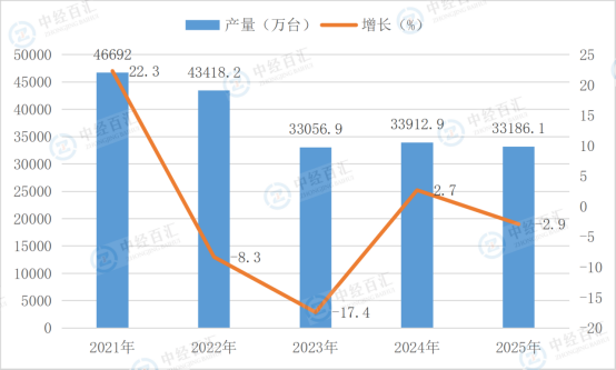 根据国家统计局数据显示,2025年,微型计算机设备产量33186.1万台,同比增长-2.9%。