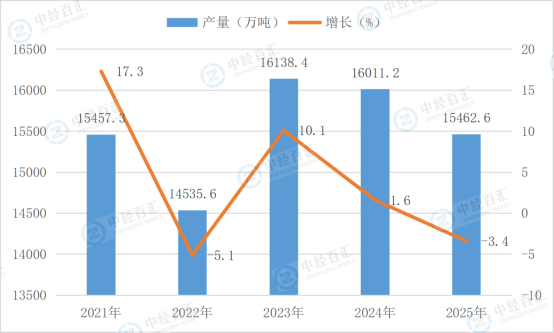 根据国家统计局数据显示,2025年,汽油产量15462.6万吨,同比增长-3.4%。