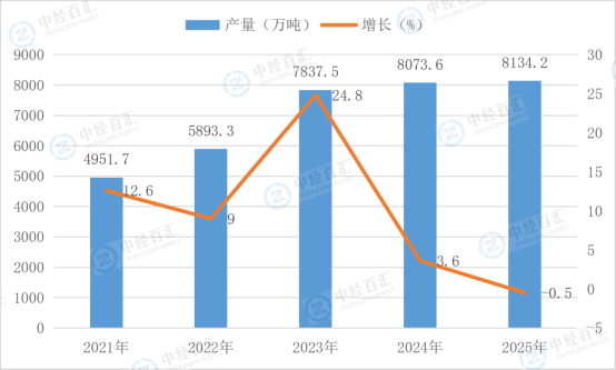 根据国家统计局数据显示,2025年,石脑油产量8134.2万吨,同比增长-0.5%。