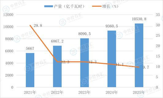 图表:2021-2025年中国风力发电量及增长