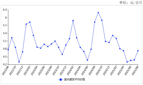 (三)预计后期蔬菜价格涨幅有所收窄,且逐步转为季节性下行。今年蔬菜在田面积有所增加,稳产保供的基础较为牢固。随着蔬菜主产区降雨强度及频次的减少,前期因频繁降雨、强对流天气等导致的蔬菜生长缓慢、采收困难、运输受阻等问题将逐步缓解,蔬菜市场供应有望逐渐恢复,菜价上涨动力不足。但汛期尚未结束,据国家气候中心预测,9月份华北大部、内蒙古中西部等地降水较常年同期偏多,局部地区仍需警惕降雨对蔬菜生产上市造成的不利影响,要加强蔬菜生产田间管理,强化不利天气预测预警,加强区域间蔬菜的应急调配能力,做好蔬菜市场运行监测等。总的来看,预计后期蔬菜价格环比上涨幅度趋缓,并逐步转入季节性下行区间。