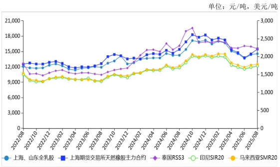 图表:2022-2025年8月天然橡胶价格走势图