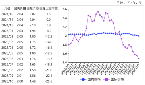 (四)国内外价差继续扩大。10月份,配额内1%关税下泰国大米到岸税后价每斤1.49元,比国内晚籼米批发价每斤低0.51元,价差比上月扩大0.06元;离岸价折人民币每斤1.25元,比国内低0.75元,低37.5%。