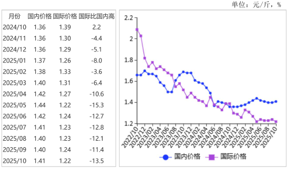 (四)国内外价差扩大。10月份,美国墨西哥湾硬红冬麦(蛋白质含量12%)离岸价直接折人民币每斤0.82元,比优质麦产区批发价低0.59元;配额内1%关税下到岸税后价约每斤1.22元,比国内优质麦销区价低0.19元,价差比上月扩大0.03元。