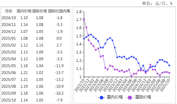 (三)国内外价差缩小。10月份,美国墨西哥湾2级黄玉米平均离岸价折合人民币每斤0.72元,比国内产区批发价低0.34元;进口配额内1%关税的国外玉米运抵我国南方港口的到岸税后价每斤1.05元,比国内玉米到港价低0.09元,价差比上月缩小0.03元;配额外65%关税的美国玉米运抵我国南方港口到岸税后成本每斤1.67元,比国内玉米到港价高0.53元。