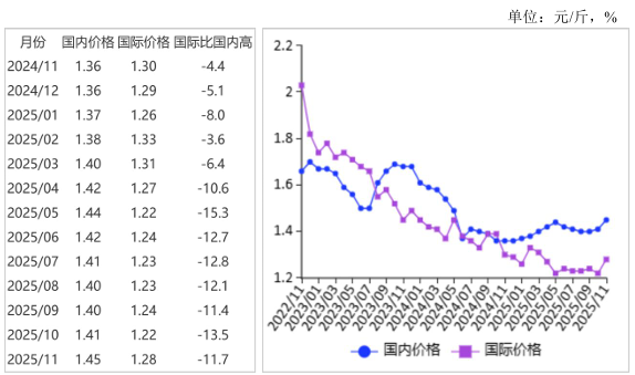 图表:2022-2025年11月国内外小麦价格走势图