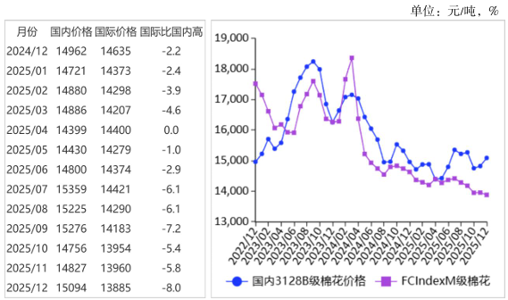 (一)国内棉价环比上涨。下游需求保持刚性,支撑棉花季节性消费,带动国内棉价上涨。12月份,国内3128B级棉花月均价每吨15094元,环比涨1.8%,同比涨0.9%。郑棉期货主力合约(CF605)月结算价每吨14495元,环比涨6.6%,同比涨7.3%。