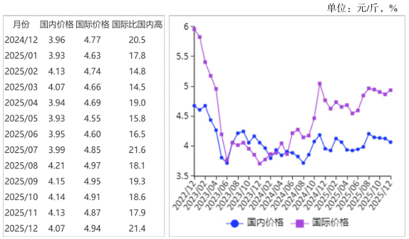 (二)国际油菜籽价格下跌,食用植物油价格涨跌分化。加拿大油菜籽供给充足,但出口缓慢,库存累积导致油菜籽价格下跌。马来西亚棕榈油出口量不及预期,库存有一定程度累积,导致价格微跌。南美豆油处于供给低谷期,支撑价格略涨。12月份,加拿大油菜籽CNF价月均价(离岸价+运费)每吨512美元,环比跌2.5%,同比涨1.6%;南美豆油CNF价月均价每吨1165美元,环比涨1.7%,同比涨6.6%;马来西亚24度棕榈油离岸CNF价月均价每吨1031美元,环比跌0.3%,同比跌15.1%。