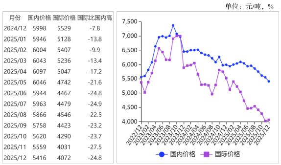 (一)国内糖价稳中有跌。临近春节消费旺季,有效拉动食糖消费需求。25/26榨季广西73家糖厂已全部开榨,云南糖厂开榨进度快于去年同期,新糖上市节奏逐步加快,国内食糖市场总体供大于求。12月份,国内食糖均价每吨5416元,环比跌2.6%,同比跌9.7%。