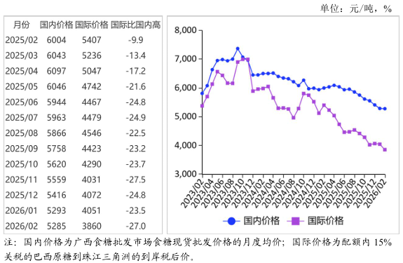 (二)国际糖价明显下跌。全球食糖主产国处于增产周期,全球食糖总体供应宽松。巴西蔗糖工业协会(Unica)公布的数据显示,截至1月中旬,2025/26榨季巴西中南部地区累计产糖量同比增长0.9%,达4023.6万吨;同时,用于制糖的甘蔗比例从上一榨季的48.15%提升至50.78%。印度糖业与生物能源制造商协会(ISMA)发布的2025/26榨季第三次预估报告显示,印度食糖总产量预计为3240万吨。泰国糖业公司(ThaiSugarMillersCorp)预计,2025/26榨季泰国食糖产量同比增长5%至1050万吨。2月份,国际食糖均价(洲际交易所11号原糖期货均价,下同)每磅13.81美分,环比跌6.7%,同比跌31.4%。