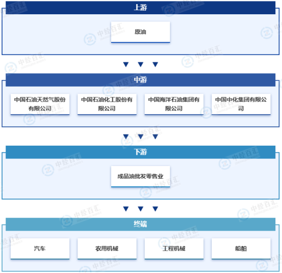 成品油行业产业链包括三个主要部分:(1)上游油田的勘探与开采以及原油进口。(2)中游为石油炼化加工为成品油;(3)下游为成品油流通渠道及消费者。由于我国可开采的原油资源达不到我国的消费需求,所以原油的进口也是上游产业链关键的一环。上游勘探与开采一般由三大国有巨头主导。中游的石油炼化加工由三大国有巨头主导,亦有少数地方非国有炼油厂从事生产及炼油活动。三大国有巨头亦参与下游的成品油批发零售业务(即加油站业务),但其主要业务重点为勘探石油资源并炼制及研发产品。因此,由于成品油批发零售企业具有资金、物流、储存及网络能力以助成品油产品可及时交付,从而能够缩短上游生产商与下游用户的距离,故成品油批发零售企业透过填补并无三大国有巨头满足的市场需求于成品油行业价值链中发挥重要作用。成品油的直接消费领域包括汽车、农用机械、工程机械、船舶、飞机、摩托车等。成品油行业产业链如下图所示: