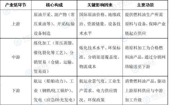 燃料油行业产业链呈现“上游供给—中游加工分销—下游应用”的清晰层级结构,各环节紧密关联、相互影响,共同构成完整的产业生态。上游环节为整个产业链提供基础原料,其资源储量、开采成本及供应稳定性直接决定燃料油的生产起点;中游环节承担原料加工转化与市场流通的核心职能,通过炼化工艺将原油等原料转化为符合不同标准的燃料油产品,并借助分销网络实现产品向下游的输送;下游环节则是燃料油的终端消费领域,其需求变化、行业发展趋势及环保政策要求,反向推动中游加工技术升级与上游原料结构调整,形成产业链的动态平衡机制。整体来看,燃料油产业链受国际原油价格、环保法规、能源替代趋势等外部因素影响显著,各环节的协同效率与风险应对能力,是行业稳定发展的关键。