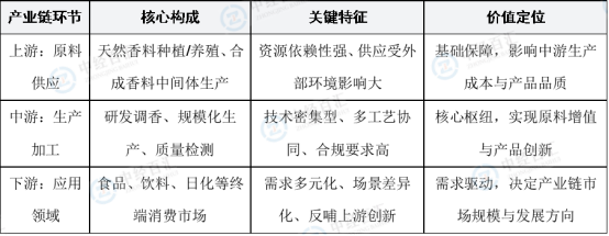 食用香精行业产业链呈现“上游原料供应-中游生产加工-下游应用消费”的清晰层级,各环节紧密联动且价值分布不均,中游的技术研发与下游的场景适配是产业链增值的核心环节。上游为行业发展提供基础原料保障,其供应稳定性与成本波动直接影响中游生产;中游通过技术整合与工艺创新将原料转化为符合市场需求的香精产品,是连接上下游的关键枢纽;下游应用领域的需求变革则反向驱动中游产品创新与上游原料结构调整,形成动态平衡的产业链生态。