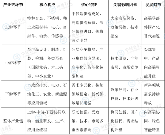 泵业产业链呈现“上游支撑、中游主导、下游牵引”的协同发展格局,上下游环节联动紧密,各环节的发展态势直接影响行业整体运行质量与发展方向;上游原材料与关键零部件的供应稳定性、技术水平决定中游泵产品的质量、成本与竞争力,中低端原材料及零部件供给充足但高端依赖进口,价格波动对中游企业盈利形成一定压力;中游作为产业链核心环节,承担产品设计、制造与组装职能,企业分层竞争明显,产业集群效应突出,头部企业向高端化、智能化转型,中小企业逐步出清;下游多领域需求多元化牵引产业链升级,市政、电力等传统领域提供稳定需求支撑,新能源等新兴领域成为增长引擎,下游行业的技术升级与政策要求推动中游产品迭代与产业链整体提质增效,同时产业链各环节的协同创新、国产化替代推进,正推动中国泵业产业链从“中低端集聚”向“高端协同”转型,提升行业整体竞争力。